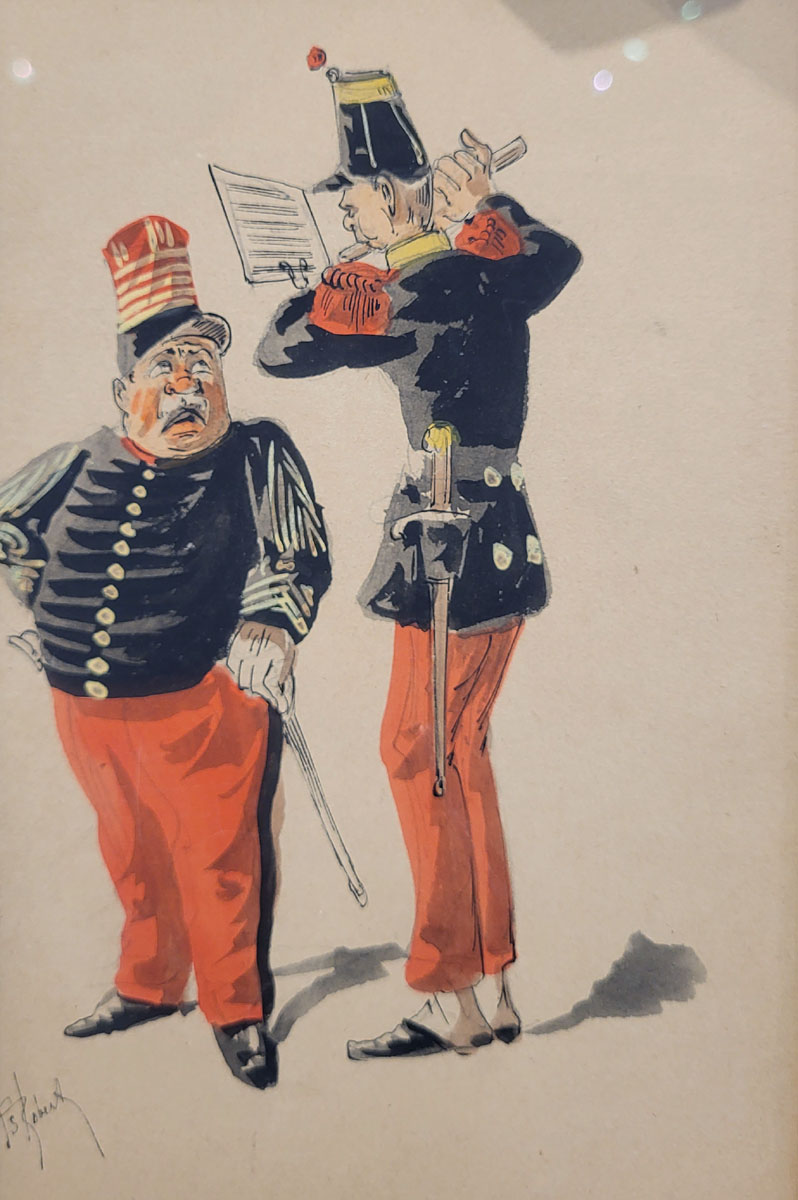 Dans ses caricatures consacrées aux fanfares militaires, Robert déploie un regard  malicieux sur l’univers de l’armée