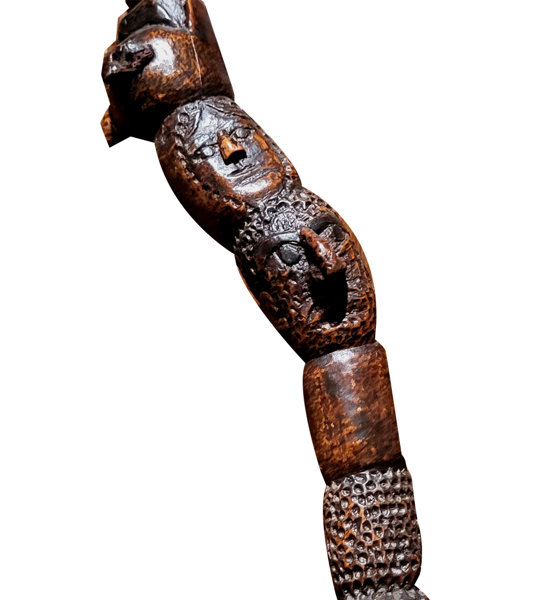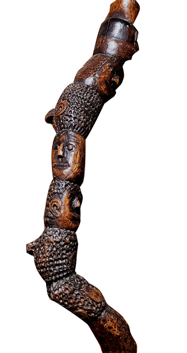 La canne présente une structure sinueuse, avec une courbure La partie supérieure de la canne est ornée de figures sculpté es en relief, représentant des visages humains.