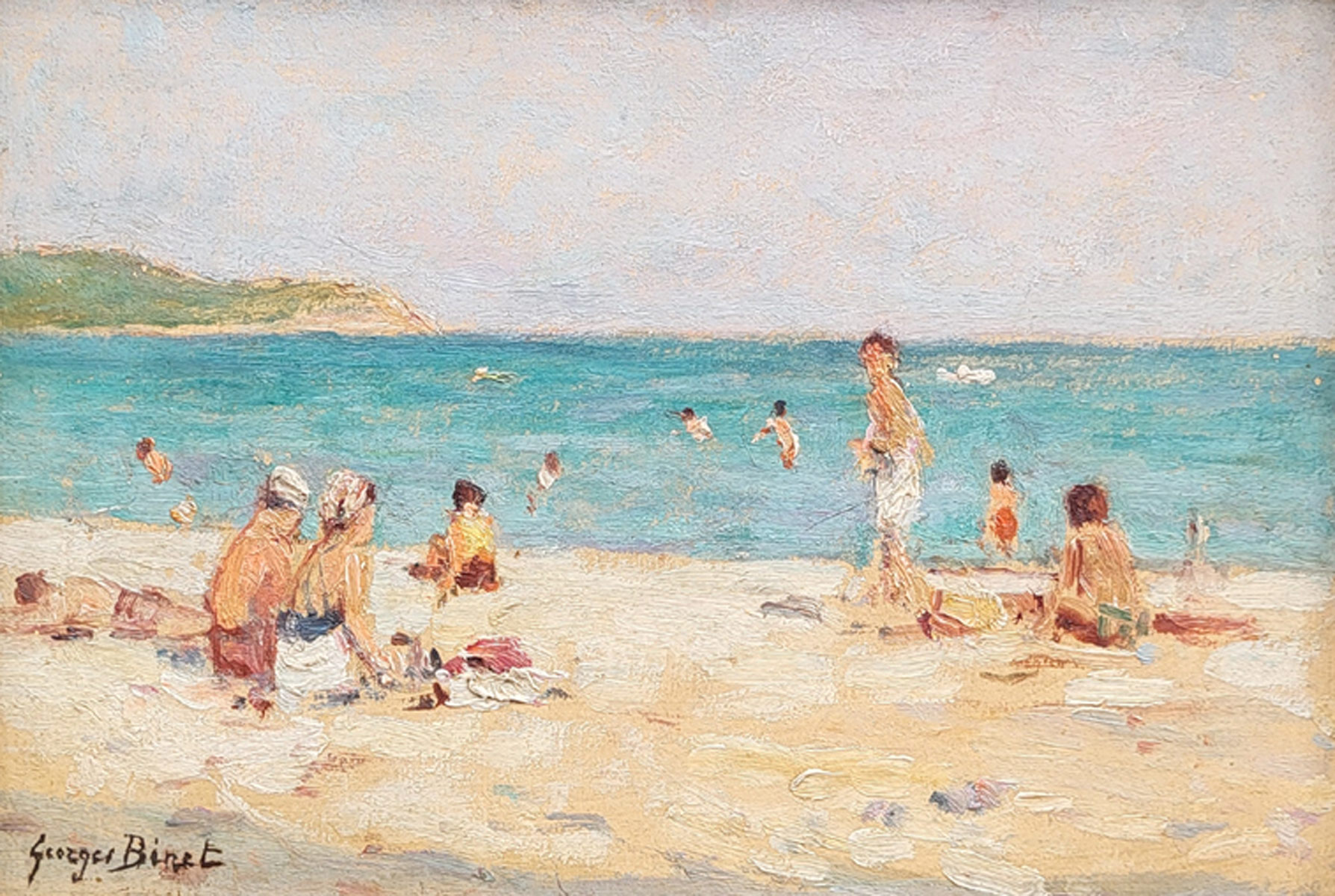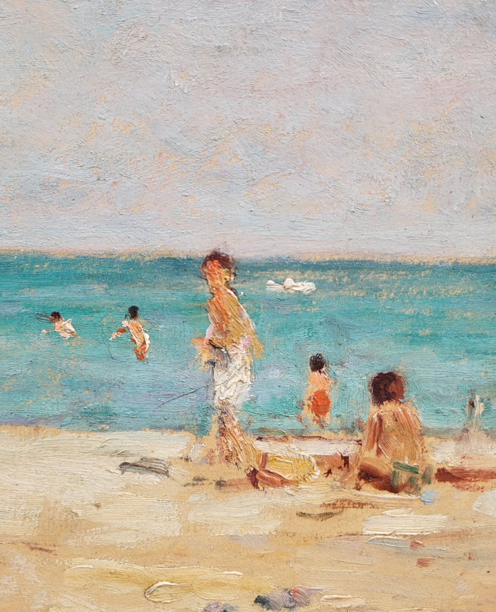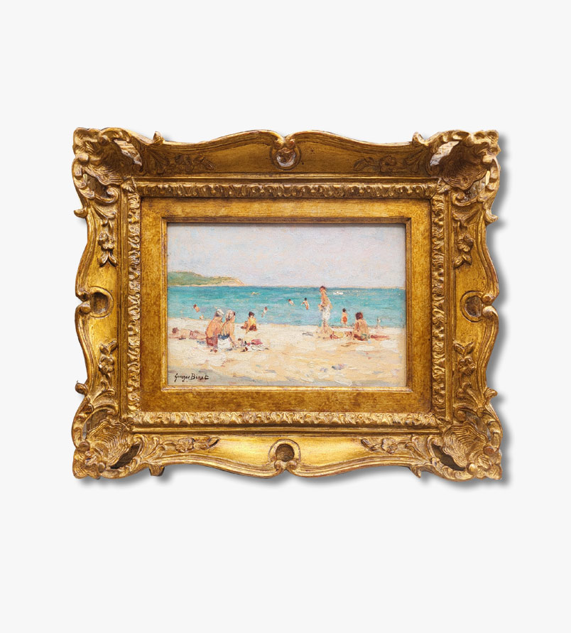 Ses scènes de plage, notamment celles du Havre ou des bords de Seine ou le Sud de France, traduisent toute la douceur de la vie maritime : le sable clair, les silhouettes de promeneurs, les ciels mouvants et les nuances infinies de l’eau. Binet y exprime une émotion subtile, entre réalisme et poésie, où la lumière devient le véritable sujet du tableau.