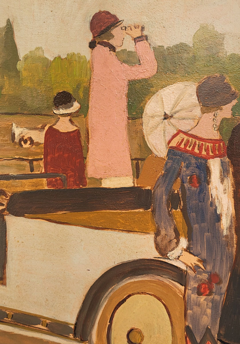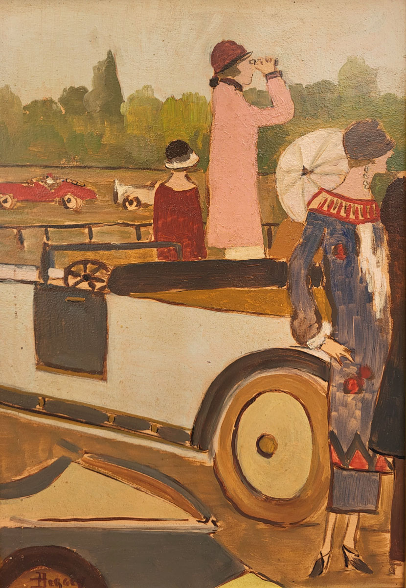 Dans un style à la fois expressif et raffiné, l’artiste dépeint des silhouettes élégantes, vêtues à la mode des années 30 rassemblées autour des voitures et des pistes.