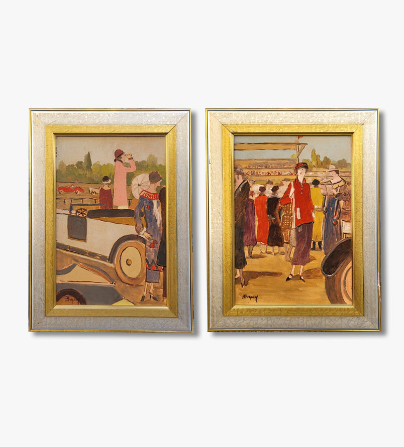 Ces deux charmants tableaux à l’huile sur panneau capturent l’élégance et l’ambiance mondaine des rallyes automobiles du début du XXe siècle.