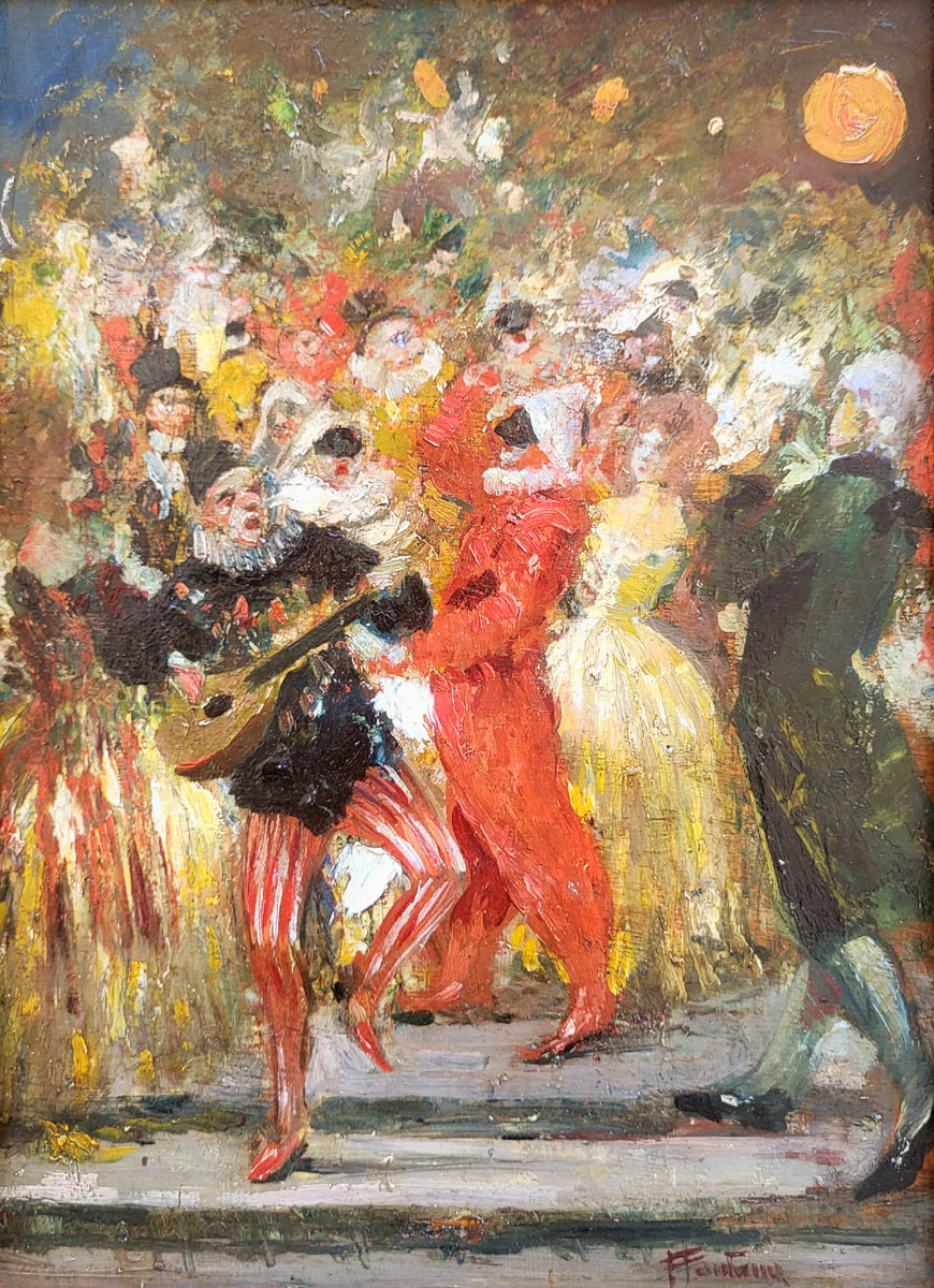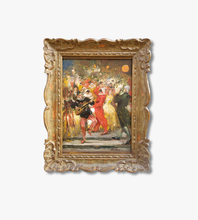 Huile sur panneau, Le bal masqué signé Fontana