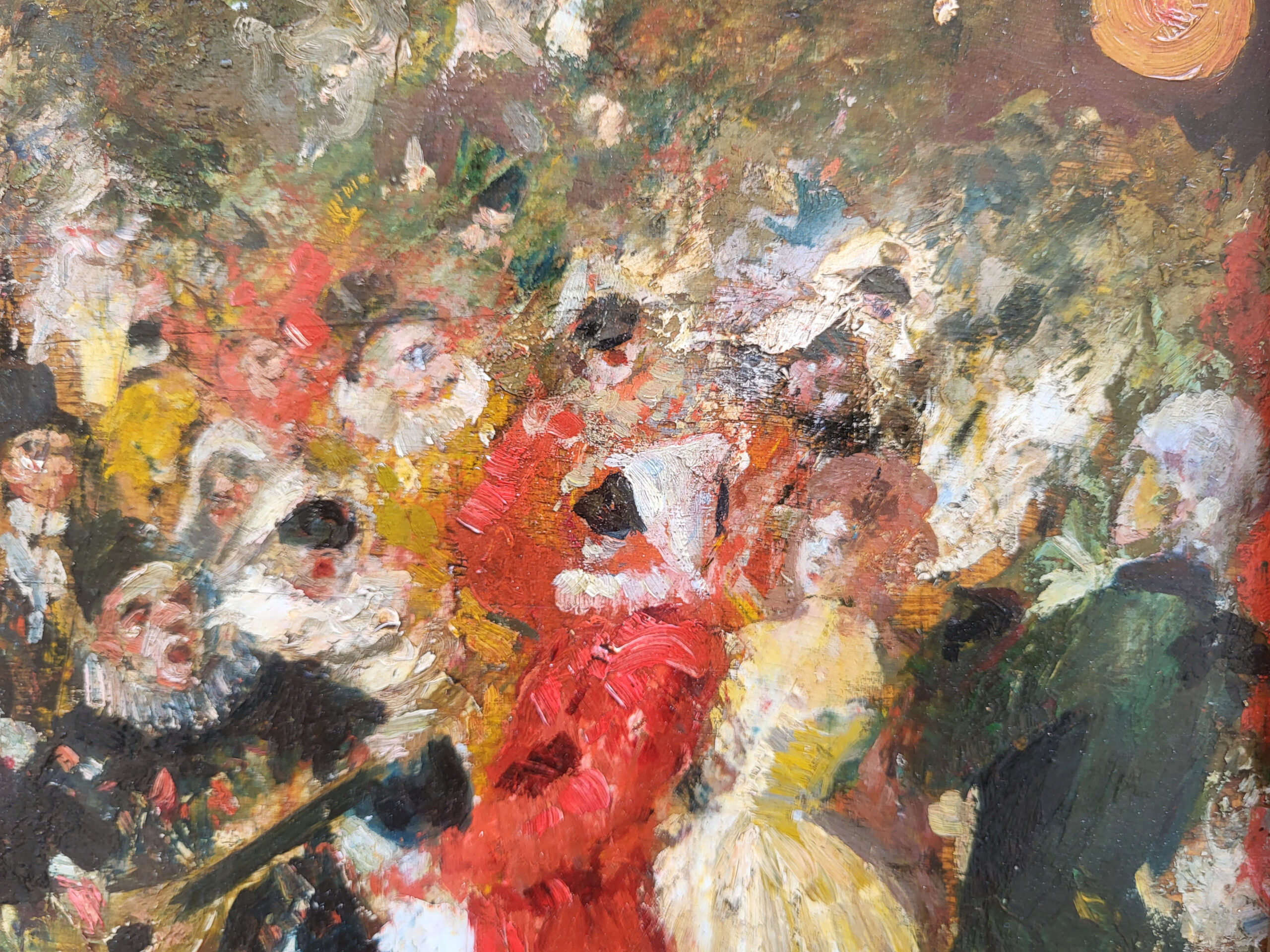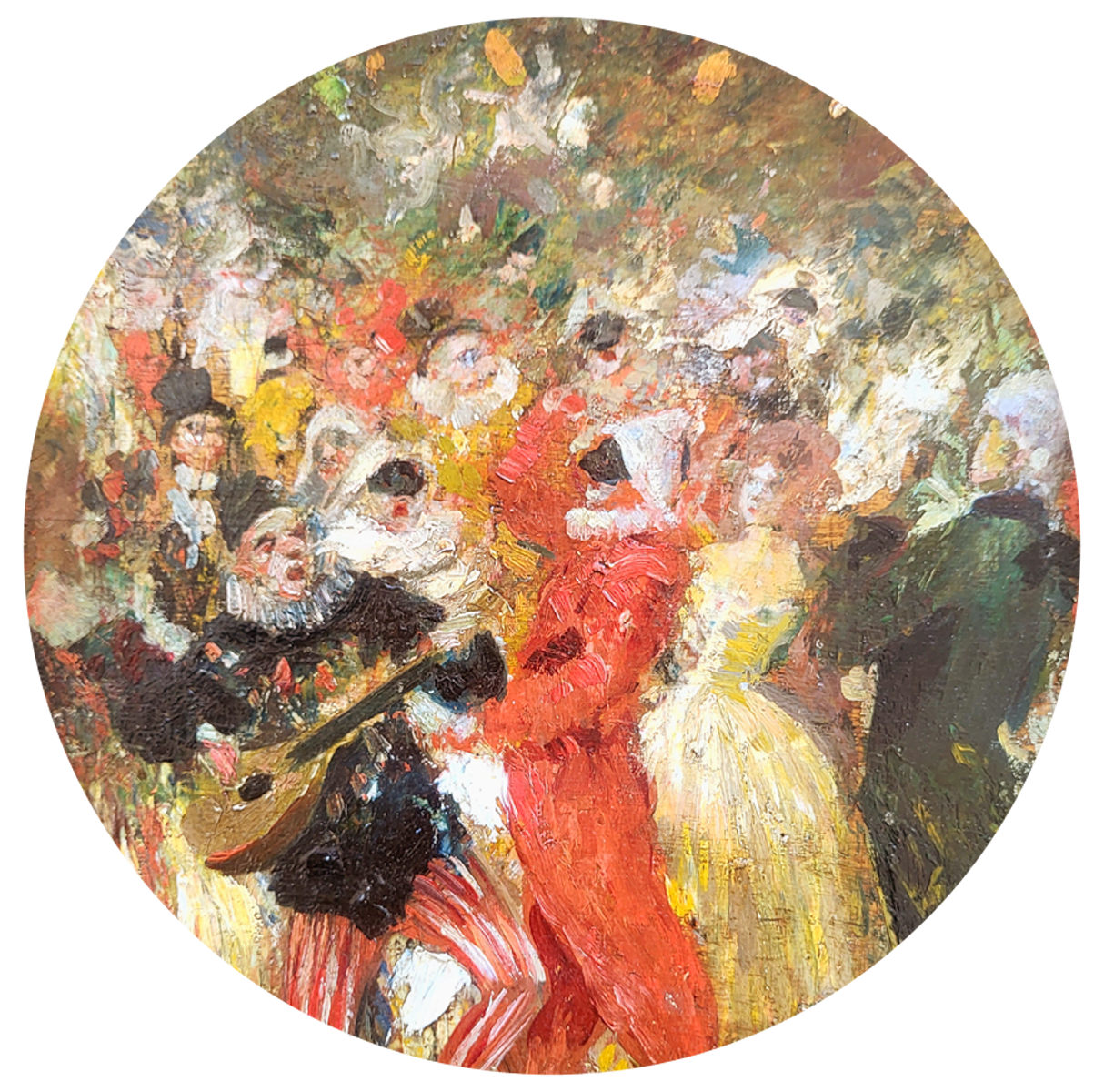 Cette peinture vibrante et pleine de mouvement représente une scène festive de bal masqué.
