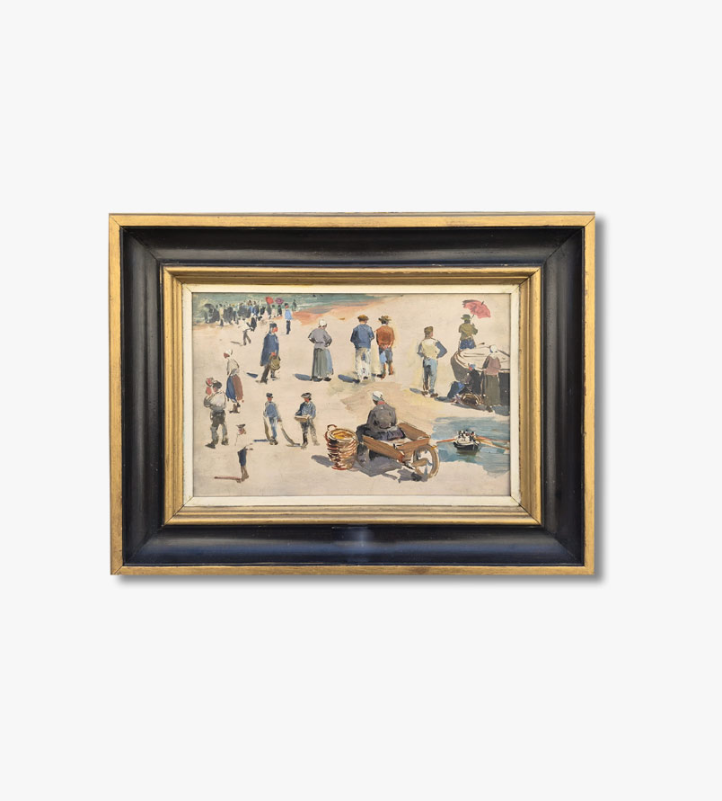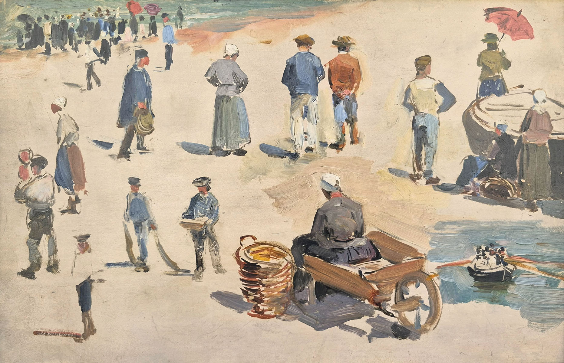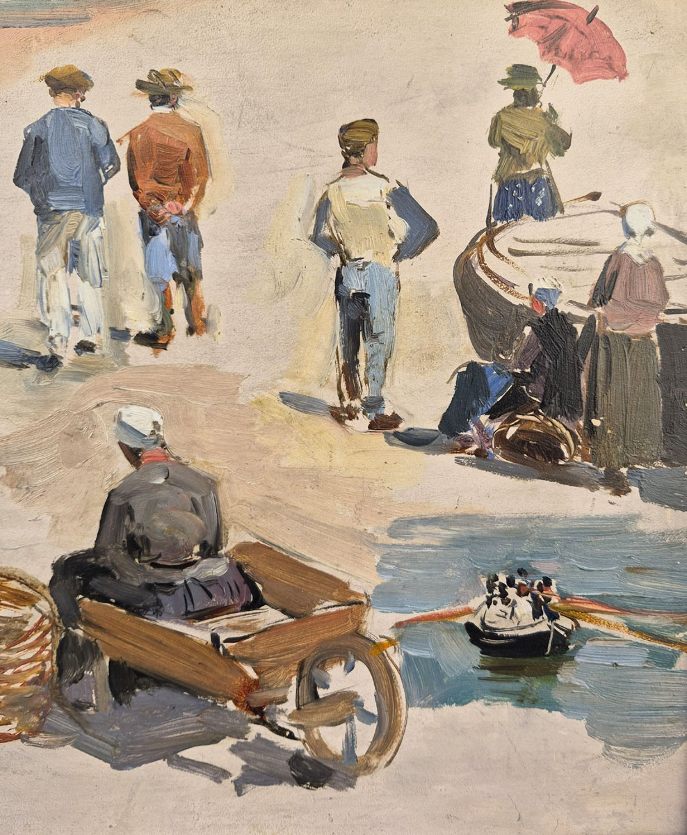 Au premier plan, des figures debout, accroupies ou manipulant paniers et charrettes évoquent le travail et les routines du port, tandis qu’à l’arrière-plan, un groupe se dirige vers l’eau, créant une impression de profondeur et de foisonnement humain.