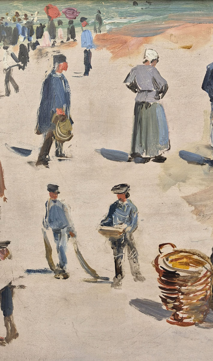 Cette œuvree représente une scène animée de bord de mer, probablement en Bretagne, où pêcheurs, vendeurs et promeneurs se côtoient dans une atmosphère quotidienne et vivante.