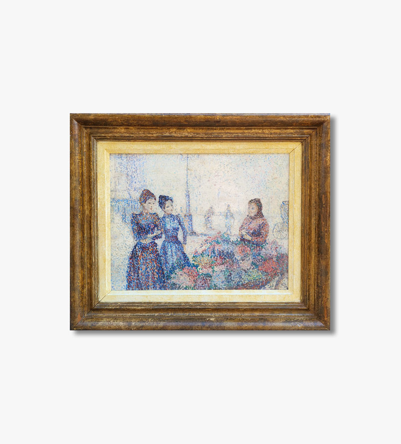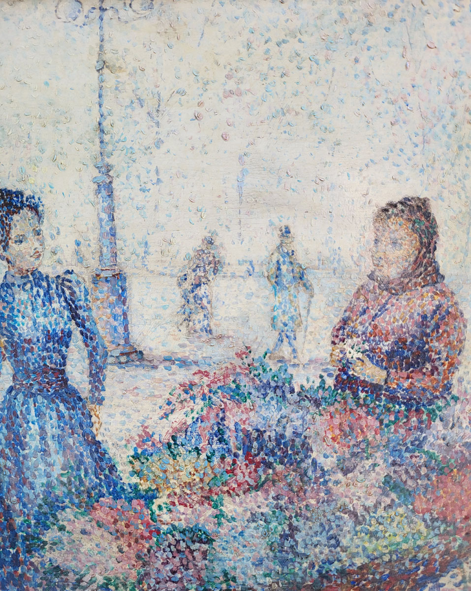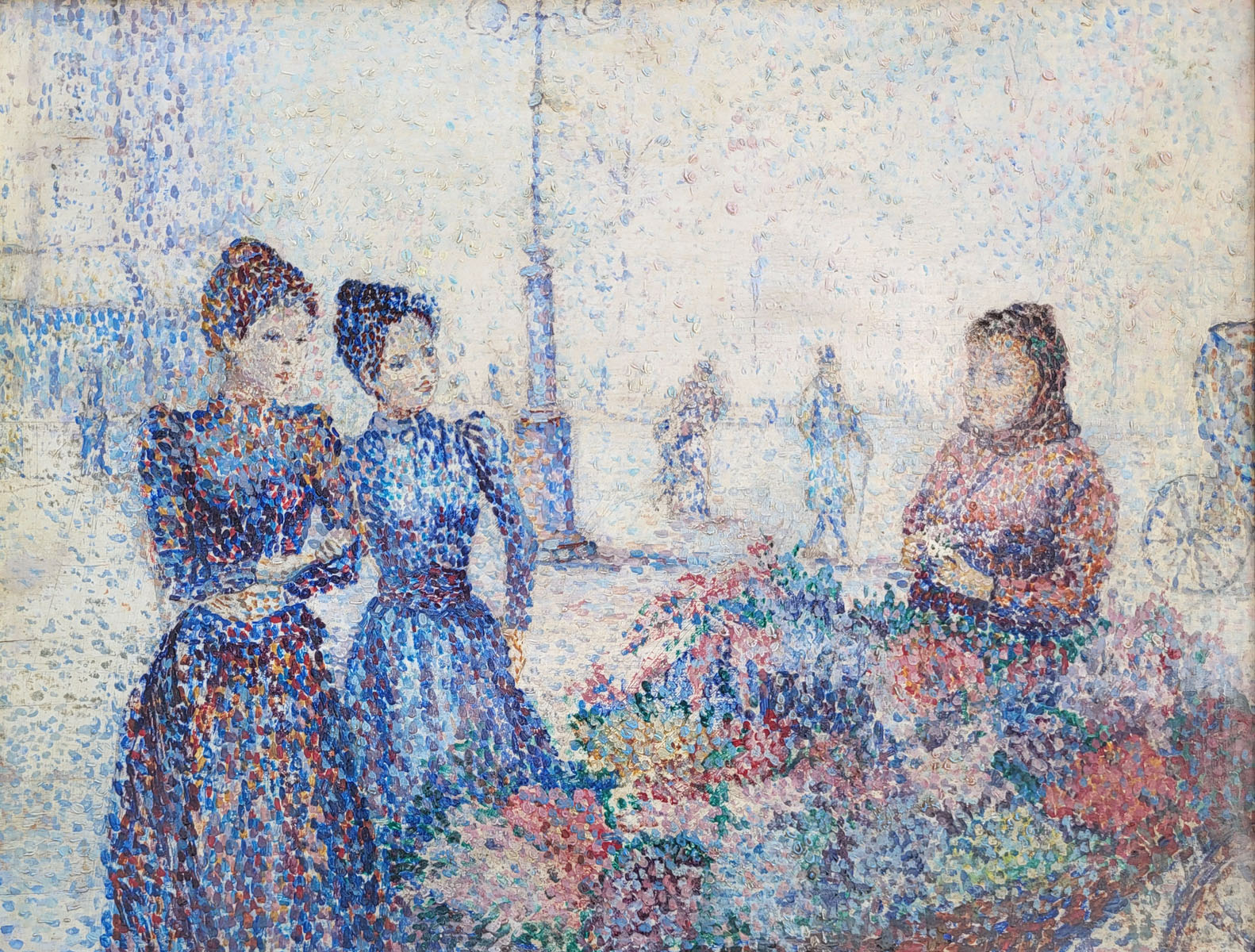 Cette composition, animée par une scène de marché aux fleurs, se distingue par une touche fragmentée et vibrante, proche du pointillisme.