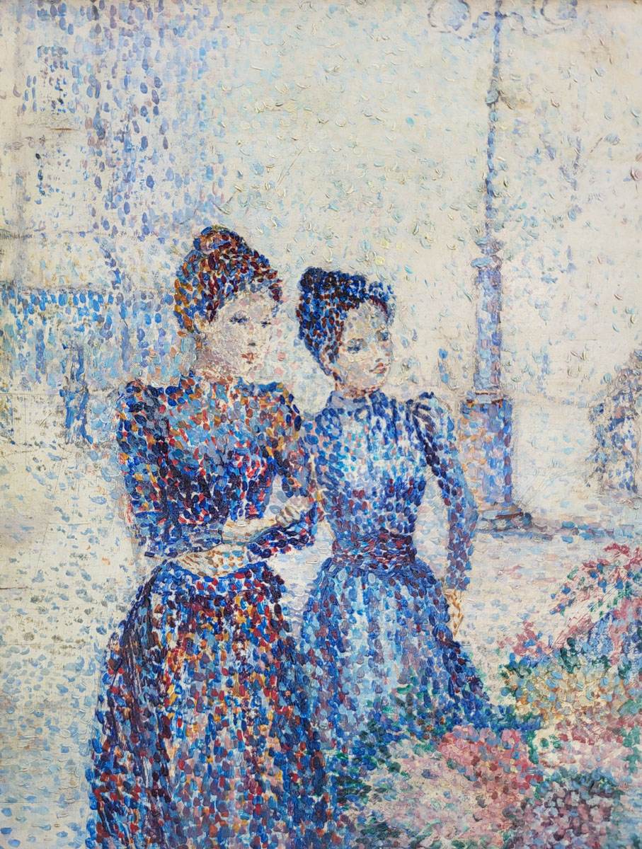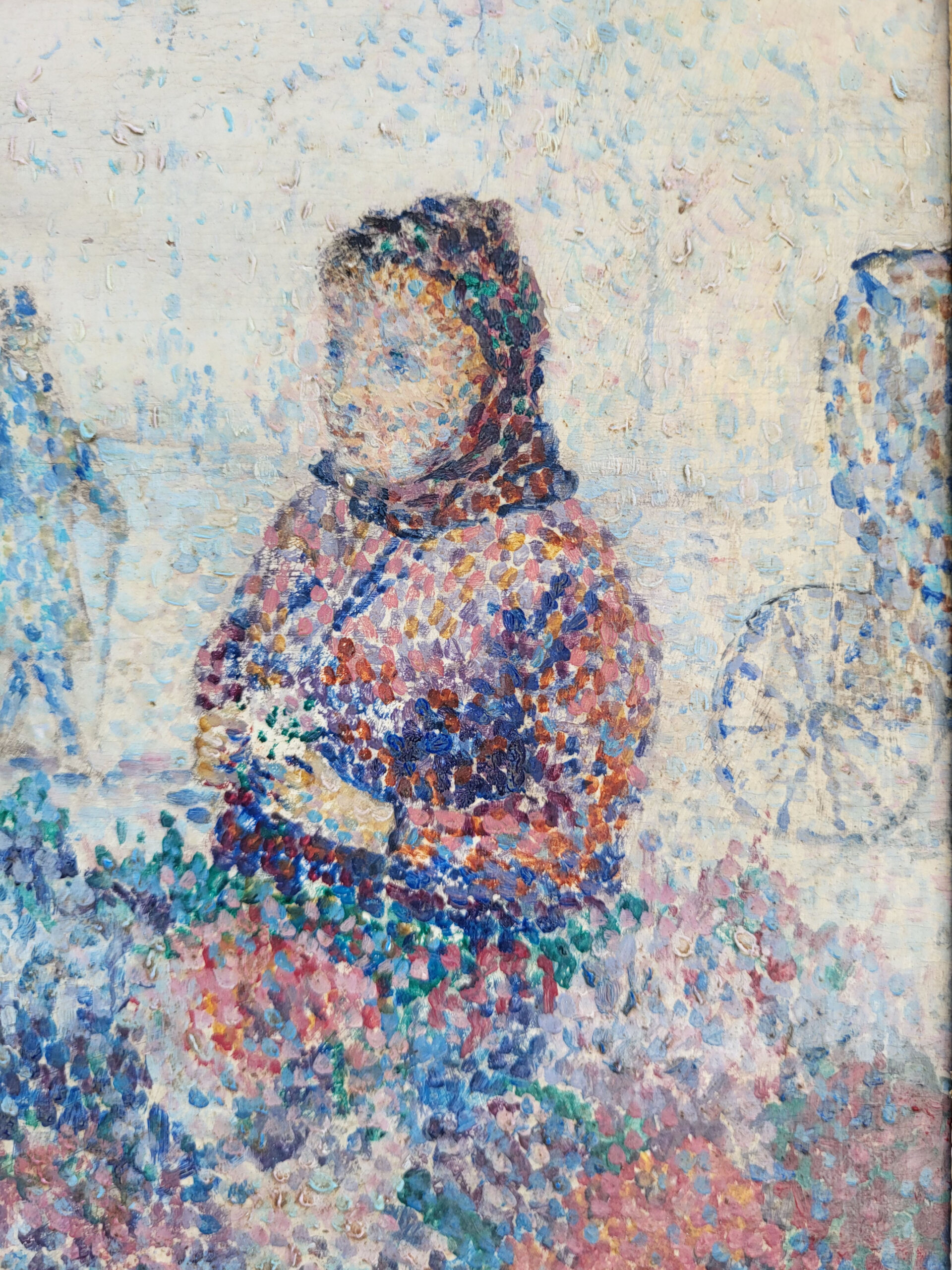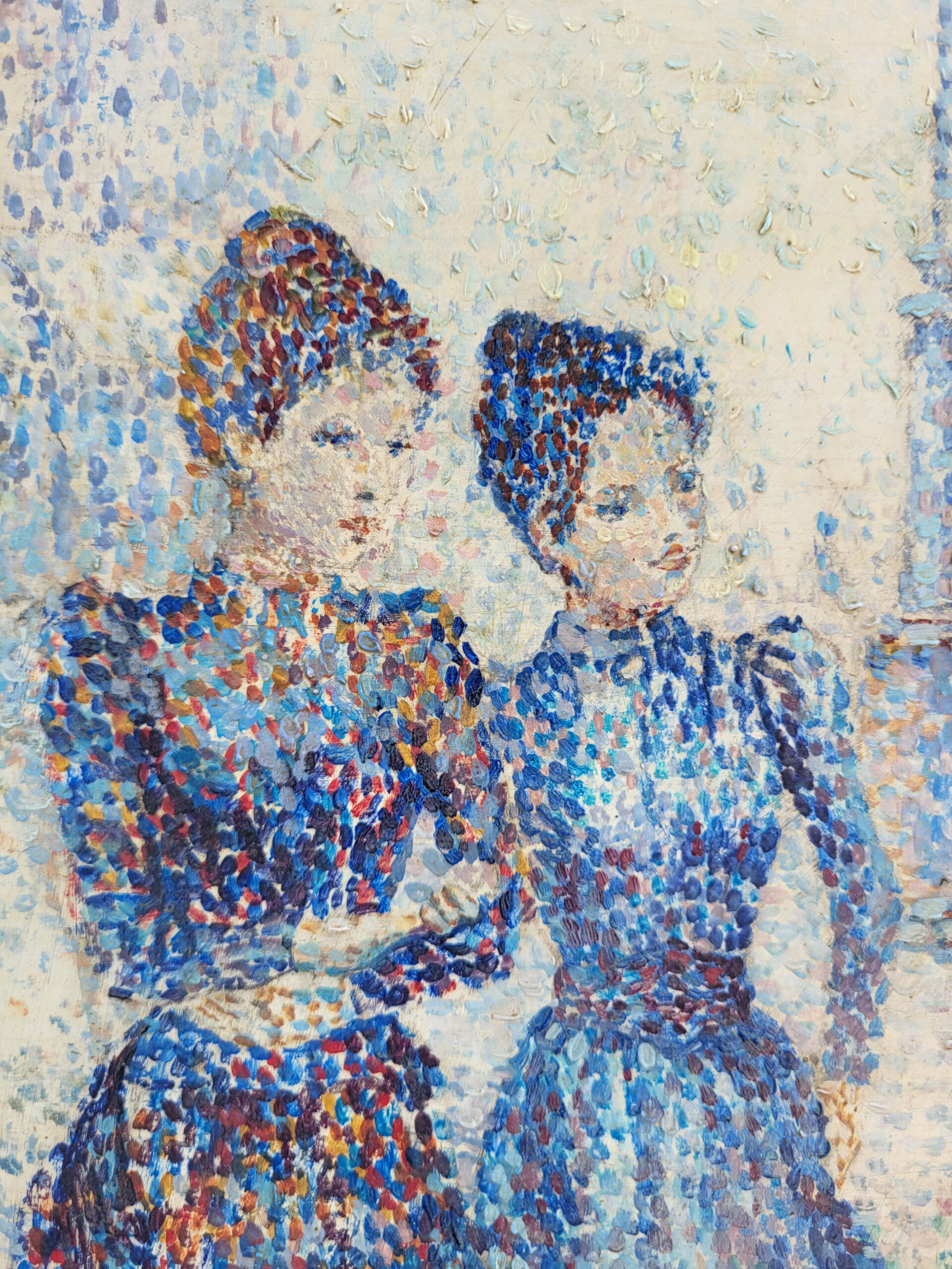 Les figures, construites par une juxtaposition de petites touches colorées, rappellent les recherches de Georges Seurat sur la décomposition de la couleur et les effets optiques.
