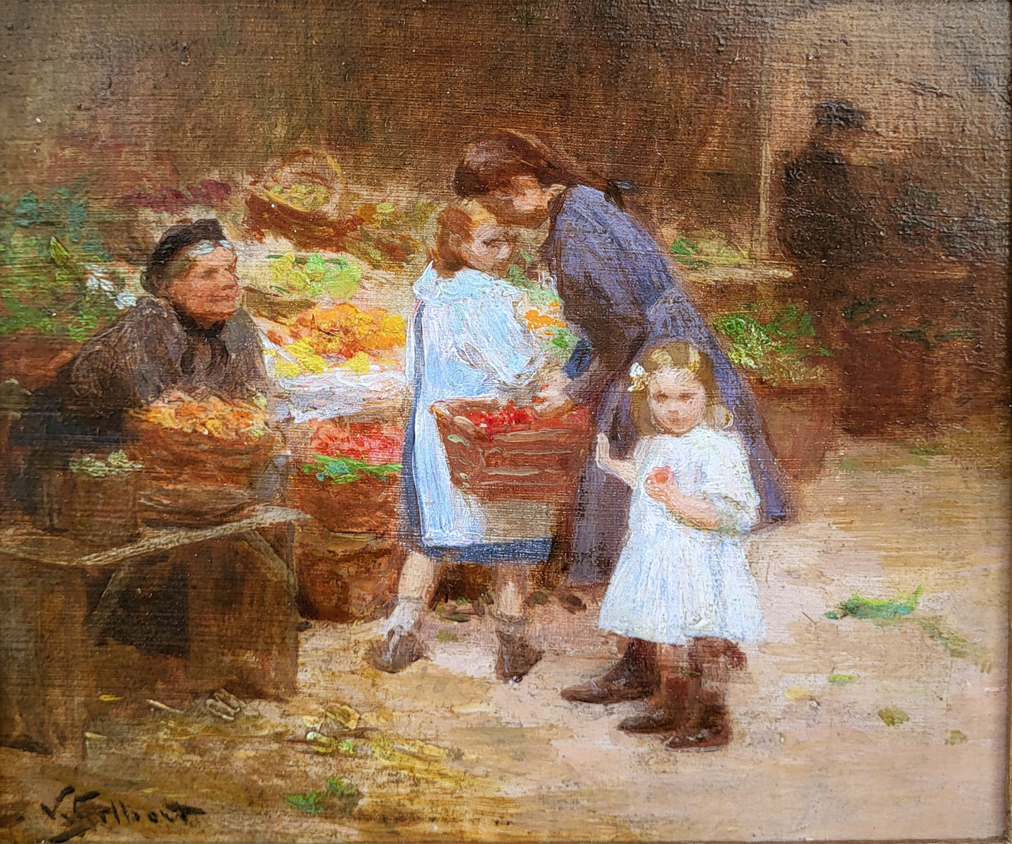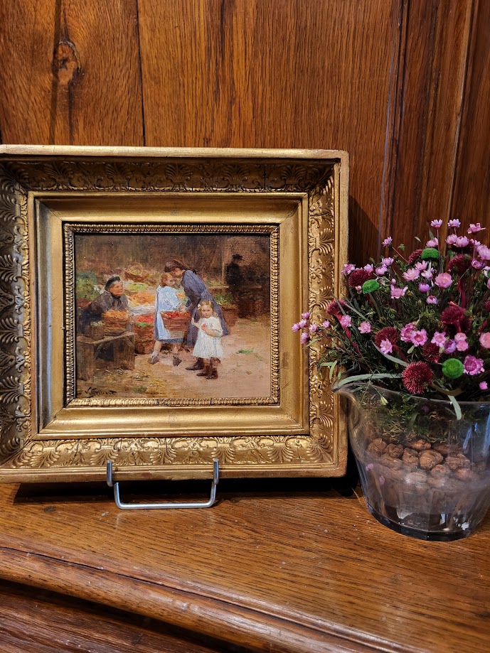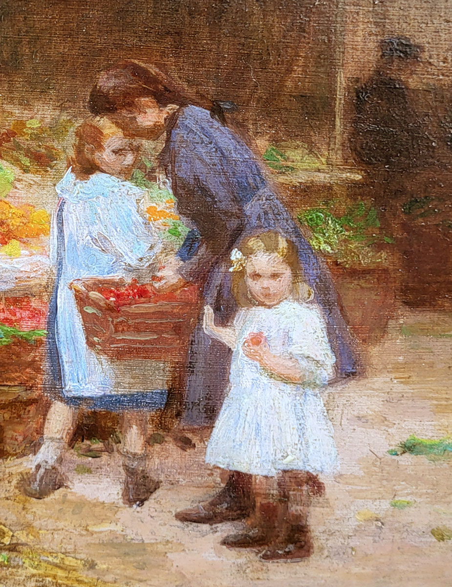 Dans cette toute petite huile de scène de marché : une mère et ses deux fillettes choisissent des fruits auprès d’une marchande installée derrière ses paniers bien garnis.