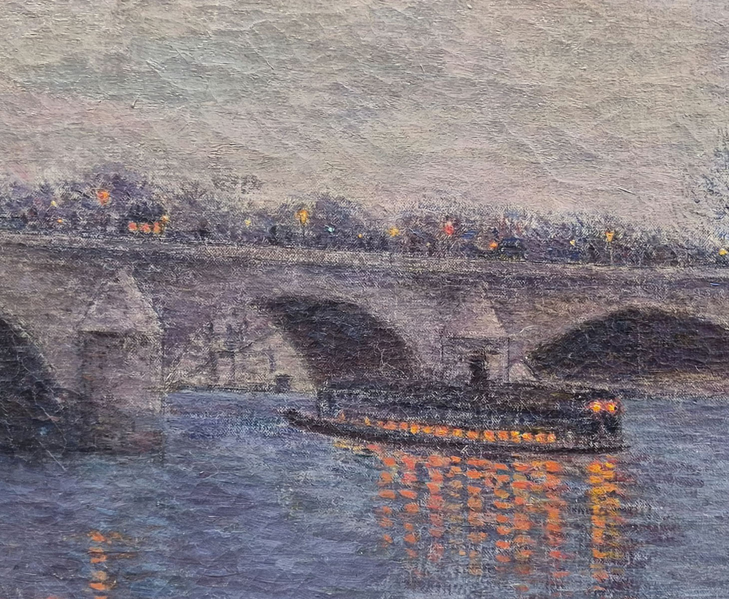 Le traitement de la lumière est particulièrement raffiné : le crépuscule enveloppe la scène d’un voile de gris et de violets, tandis que les touches ponctuelles d’orange et de jaune suggèrent l’activité humaine, discrète mais présente.