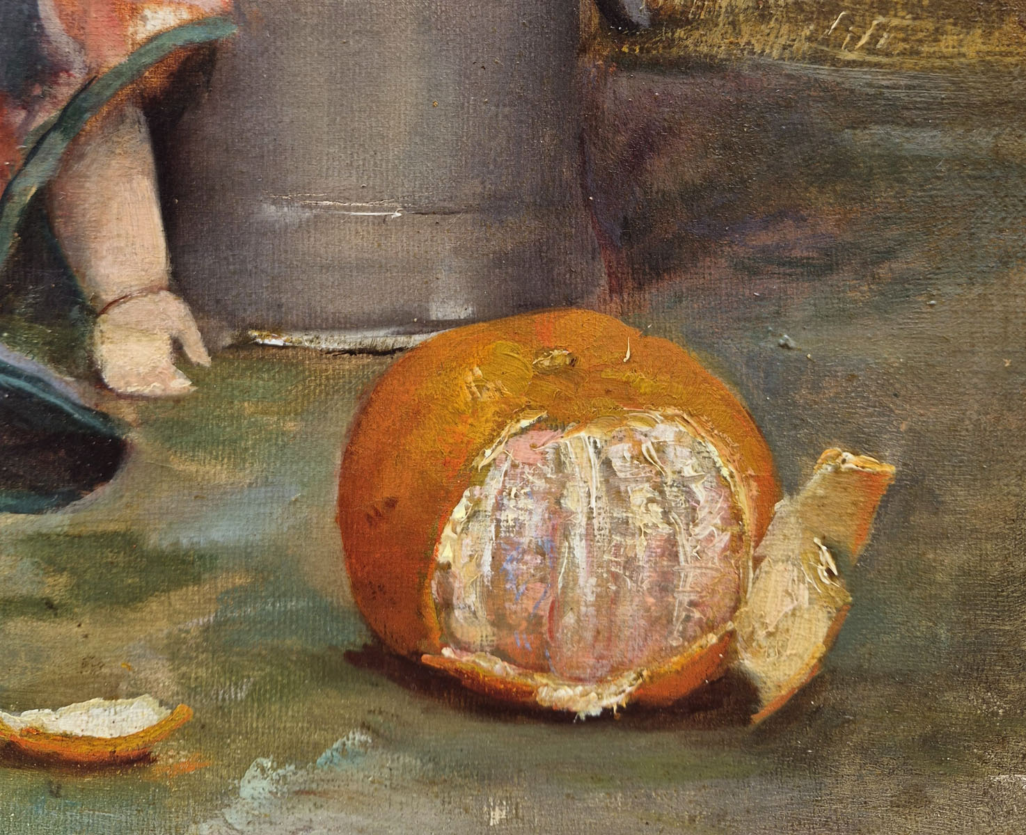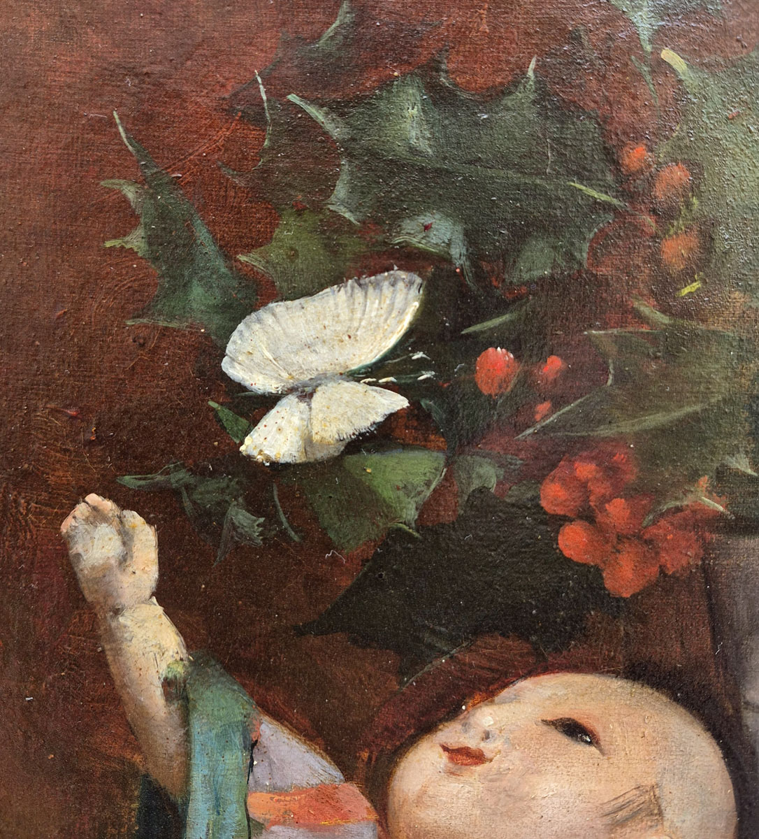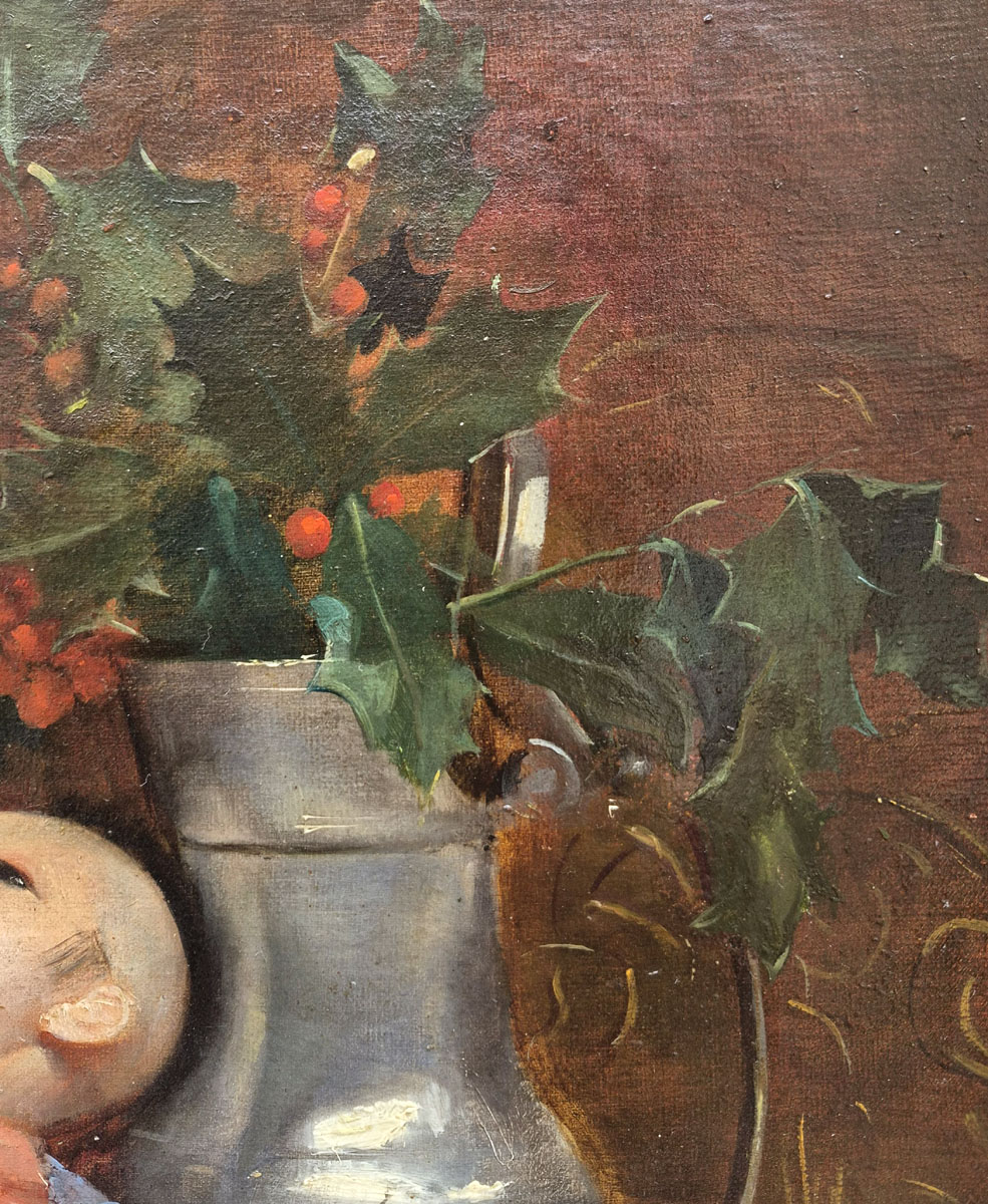 Chaque détail, de la texture des feuilles de houx aux plis du tissu de la poupée, témoigne de son soin méticuleux à rendre les matières et de son œil attentif au portrait.