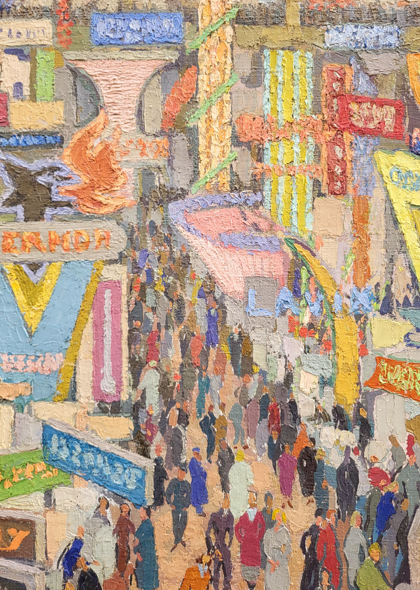 Ce choix est audacieux : il entre dans ce « temple éphémère de la consommation » pour en peindre l’animation, la lumière artificielle et les flux de visiteur